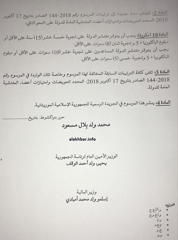 ويعدل المرسوم الجديد – الذي وقعه الوزير الأول محمد ولد بلال، والوزير الأمين العام للرئاسة يحي ولد أحمد الوقف، ووزير المالية إسلم ولد محمد امبادي – ويكمل بعض ترتيبات المرسوم رقم: 0144 – 2018 الصادر بتاريخ: 17 أكتوبر 2018 المحدد لتعويضات وامتيازات أعضاء المفتشية العامة للدولة.