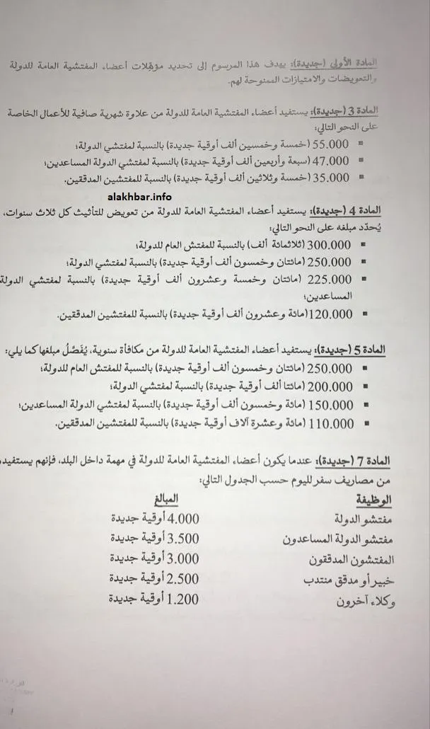 ووفقا لنص المرسوم الجديد، فقد تم منح أعضاء المفتشية العامة للدولة علاوات شهرية، ومكافأة سنوية، إضافة لعلاوات للتجهيز تمنح كل ثلاث سنوات، فضلا عن تعويض عن المهام داخل البلاد.