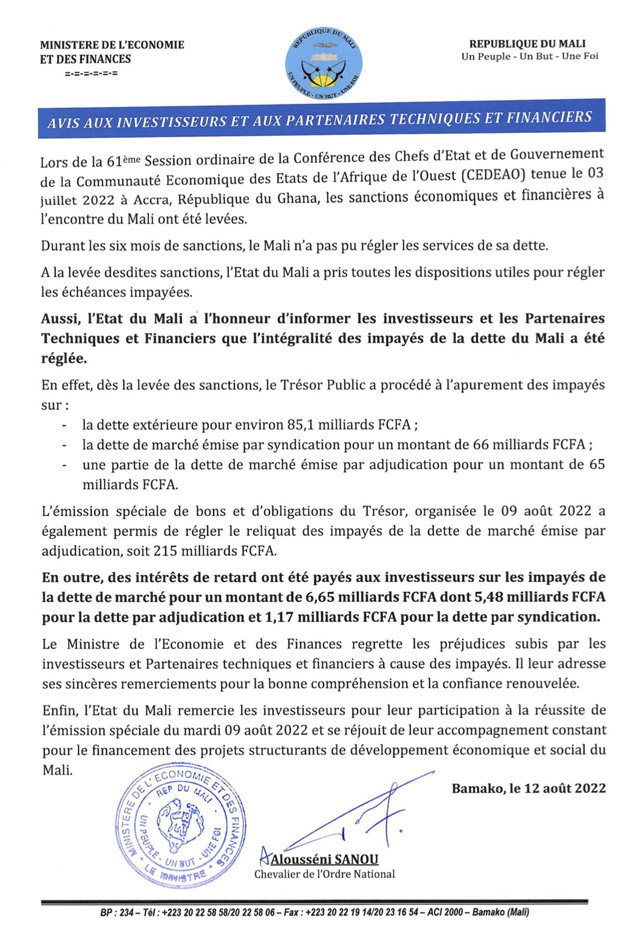 وأردفت الوزارة أنه “تم دفع فوائد متأخرة للمستثمرين على ديون السوق غير المسددة والبالغة 6.65 مليار افرنك إفريقي، بما في ذلك 5.48 مليار فرنك كدين عن طريق المزاد و1.17 مليار كديون مشتركة”.