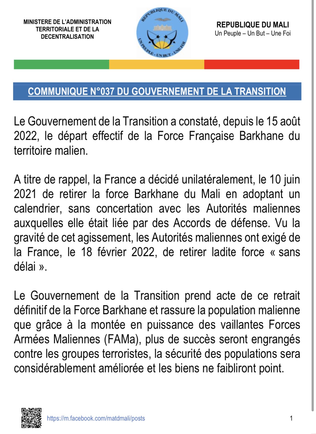 وأضاف البيان أن الحكومة المالية “أخذت علما بالانسحاب النهائي لقوة بارخان” الفرنسية، مطمئنا المواطنين أنه “بفضل تصاعد قوة وبسالة القوات المسلحة المالية سيتم إحراز نجاحات ضد المجموعات الإرهابية، وسيتم تحسين أمن السكان وممتلكاتهم”.