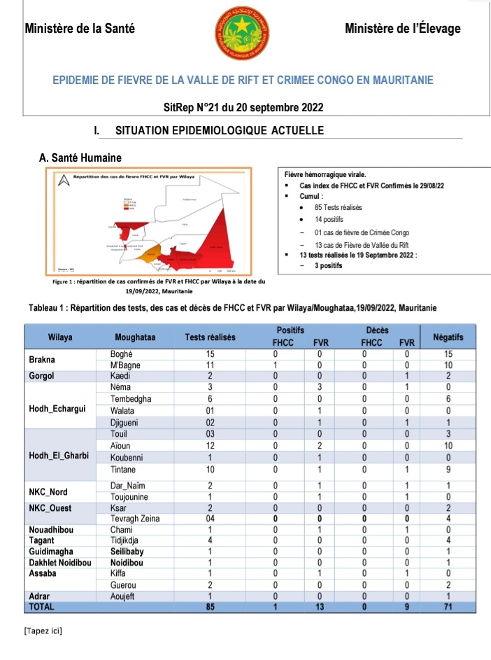 وبخصوص حمى الوادي المتصدع، فقد سجلت 5 إصابات بولاية الحوض الشرقي، 3 منها في النعمة، واثنتان توزعتا بين مدنيتي ولاته وجيكني.