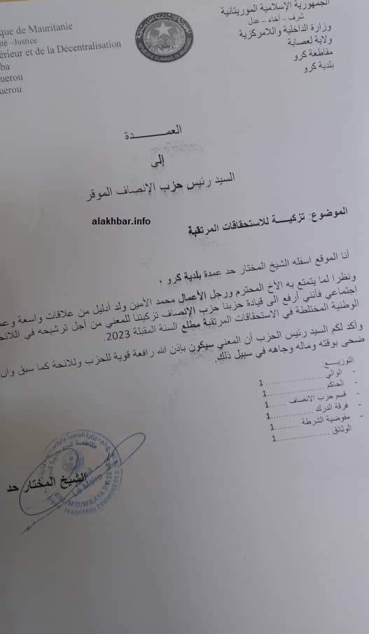 الأخبار (نواكشوط) – منح عمدة بلدية كرو الشيخ المختار حد تزكية لأحد رجال الأعمال من مواطني بلديته موجهة لرئيس حزب الإنصاف محمد ماء العينين ولد أييه لترشيحه في اللائحة الوطنية المختلطة.