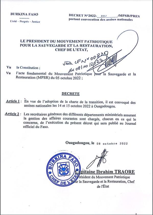 أعلن النقيب إبراهيم تراوري رئيس الحركة الوطنية من أجل الإنقاذ والإصلاح الحاكمة في بوركينافاسو، عن تنظيم جلسات وطنية يومي 14 و15 اكتوبر الحاري، لاختيار رئيس انتقالي قبل تنظيم انتخابات عام 2024 لانتخاب رئيس مدني جديد، وفق ما كان متفقا عليه مع مجموعة “إيكواس”.