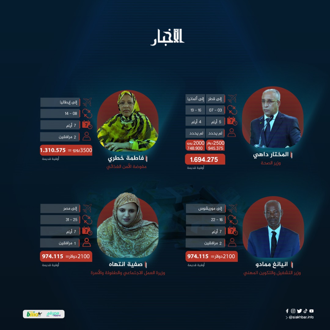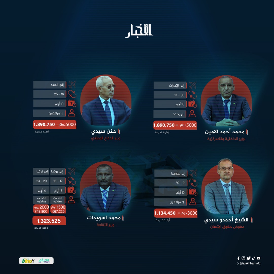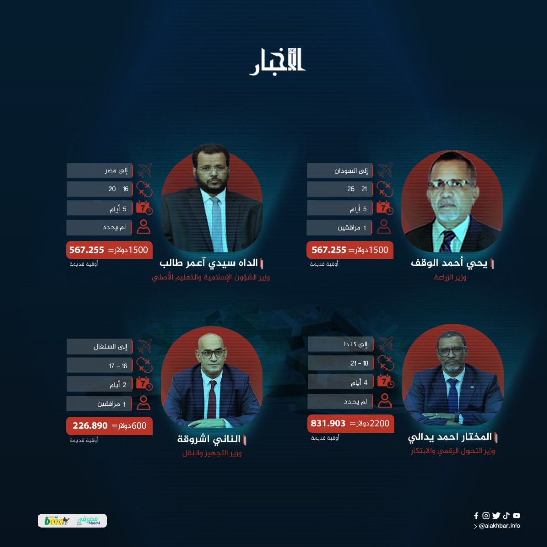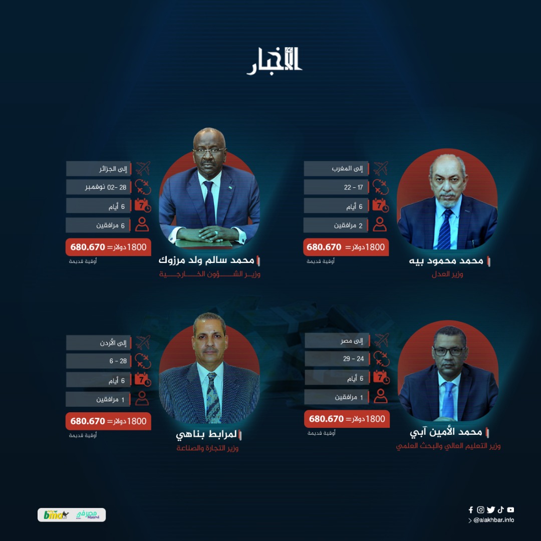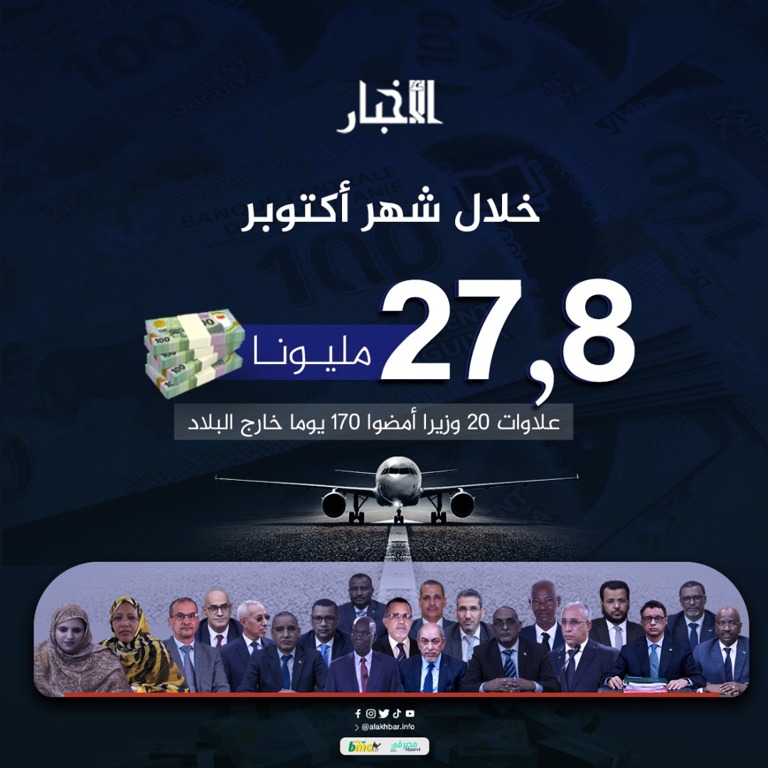 الأخبار (نواكشوط) – كشفت إحصائية أعدتها وكالة الأخبار المستقلة أن 20 من أعضاء الحكومة سافروا خارج البلاد خلال شهر أكتوبر المنصرم لمهام تتعلق بقطاعاتهم، وأمضوا ما مجموعه 170 يوما في هذه المهام، فيما تجاوز مجموع العلاوات التي حصل عليها الوزراء مقابل هذه الأسفار قرابة 28 مليون أوقية قديمة.