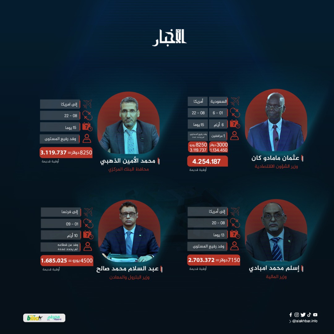 وحصل جل الوزراء الذي سافروا لمهام خارجية على مبالغ تفوق رواتبهم الشهرية، والبالغة (1.7 مليون أوقية قديمة)، وتصدرهم وزير الشؤون الاقتصادية عثمان مامادو كان، الذي حصل على مبلغ 4.2 مليون أوقية، وذلك عن مهمتيه في الرياض، وواشنطن.