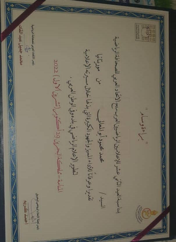 الأخبار (نواكشوط) – كرم الاتحاد العربي للصحافة الرياضية المدير العام لقناة الموريتانية محمد محمود ولد أبو المعالي.