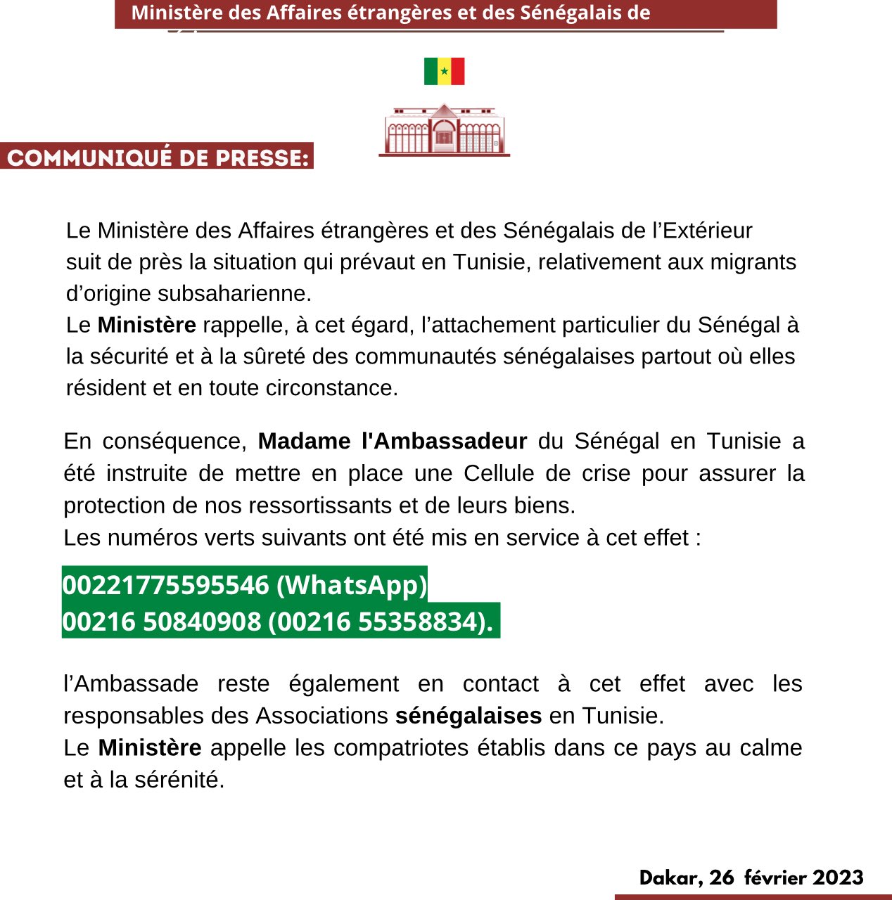 الأخبار (داكار) – أعلنت وزارة الشؤون الخارجية السنغالية عن إحداث خلية أزمة على مستوى سفارة البلاد في تونس، بهدف “السهر على تأمين وحماية المهاجرين السنغاليين المستقرين” بهذا البلد المغاربي.