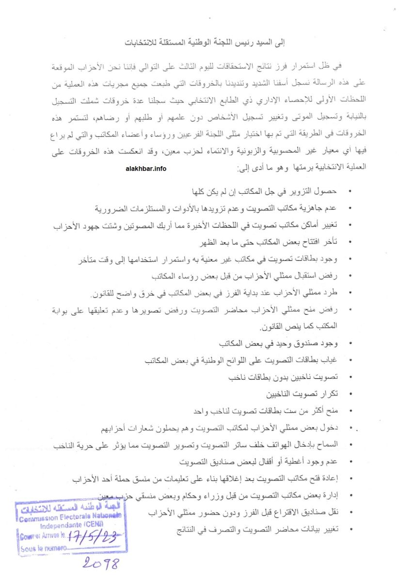 وشددت هذه الأحزاب على أن كل هذه الخروقات وغيرها من التجاوزات الخطيرة والطاعة في مصداقية العملية برمتها مثبتة لديهم بالدليل القاطع، وبالصوت والصورة والوثائق وشهادات الممثلين والمراقبين الوطنيين.