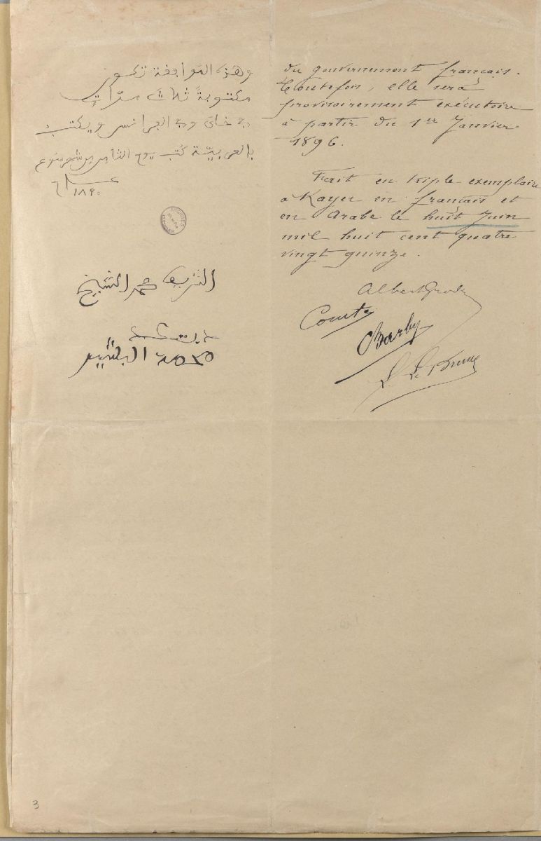 تم توقيع اتفاقية الفرنسيين مع أولاد امبارك في 4 مايو 1887م في قرية كَالُمْبَه (قالمبَه) الواقعة إلى الجنوب من مدينة النوارة المالية وبينهما ما يقارب 95 كلم، والنوارة على مشارف عدل بگرو الموريتانية بالحوض الشرقي، وبينها وبين آمرج ما يقارب 130 كلم.