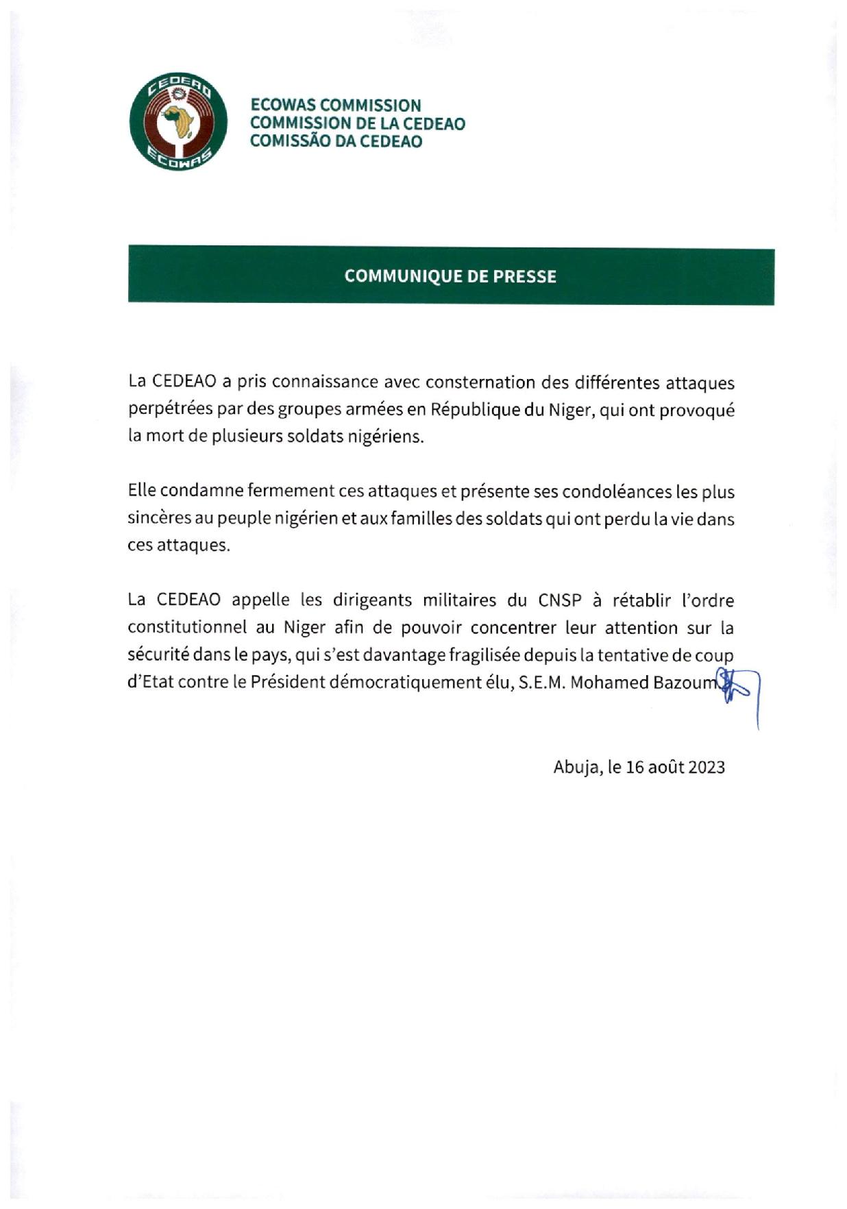 وعبرت المنظمة غرب الإفريقية عن إدانتها “الشديدة” للهجمات المسلحة المتوالية في النيجر، والتي أسفرت أحدثها عن سقوط 37 جنديا بين قتيل وجريح.