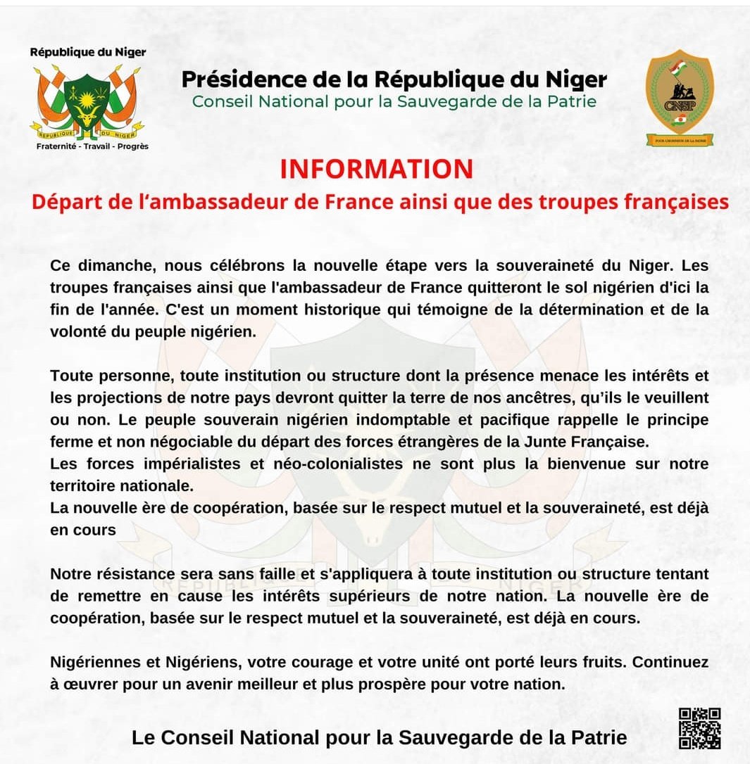 وأكد البيان أن “أي شخص أو مؤسسة أو كيان يهدد وجوده مصالح… بلدنا سيتعين عليه مغادرة أرض أجدادنا شاء ذلك أم أبى”، مردفا أن “القوى الامبريالية والاستعمارية الجديدة غير مرحب بها نهائيا” على الأراضي النيجرية.