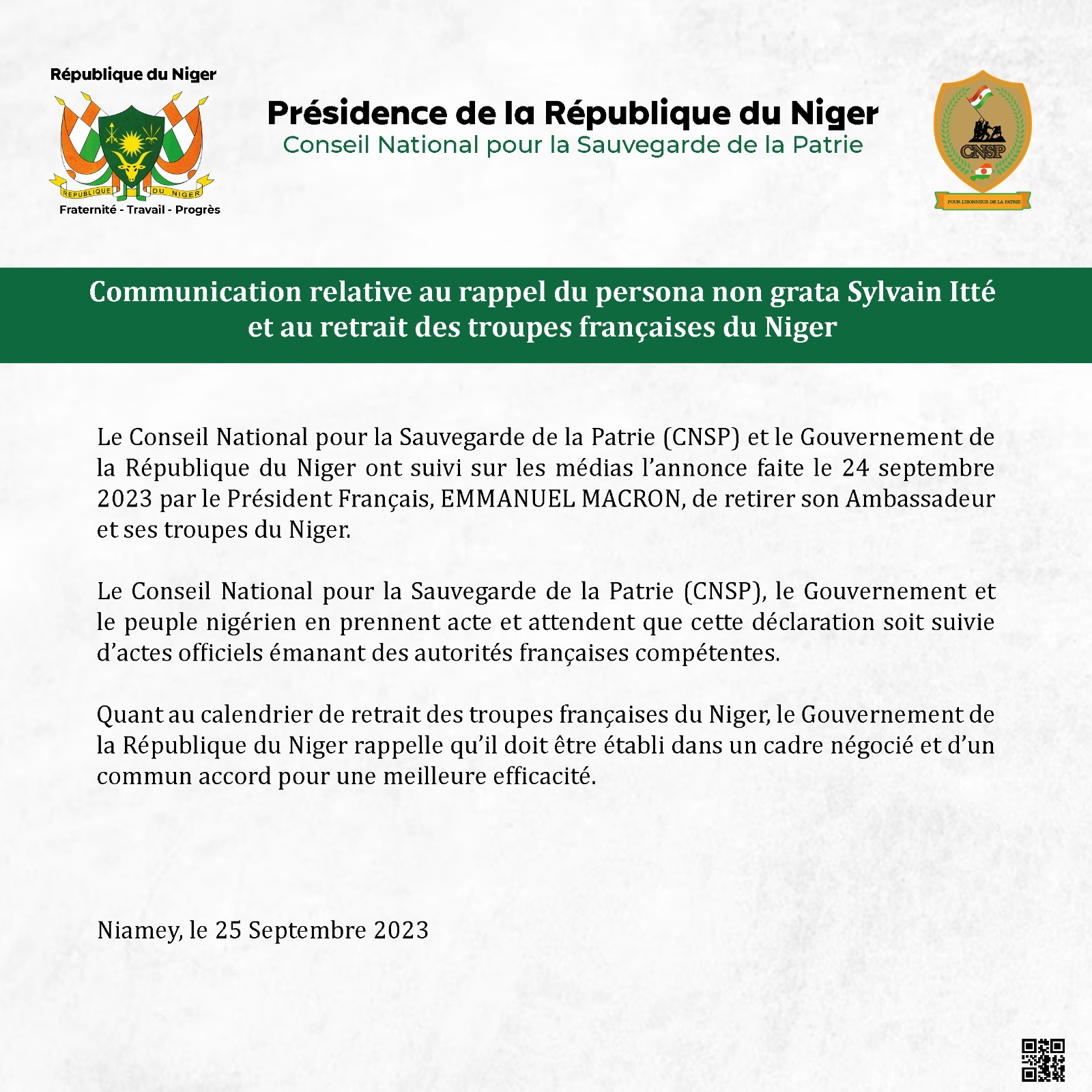 وأضاف البيان أن “المجلس الوطني لحماية الوطن، وحكومة النيجر تابعا في الإعلام إعلان الرئيس الفرنسي إيمانويل ماكرون في 24 سبتمبر 2024، عن سحب سفيره وقواته” من البلاد، مردفا أن المجلس والحكومة “أخذا علما بالأمر، وينتظران إتباع هذا الإعلان بإجراءات رسمية”.