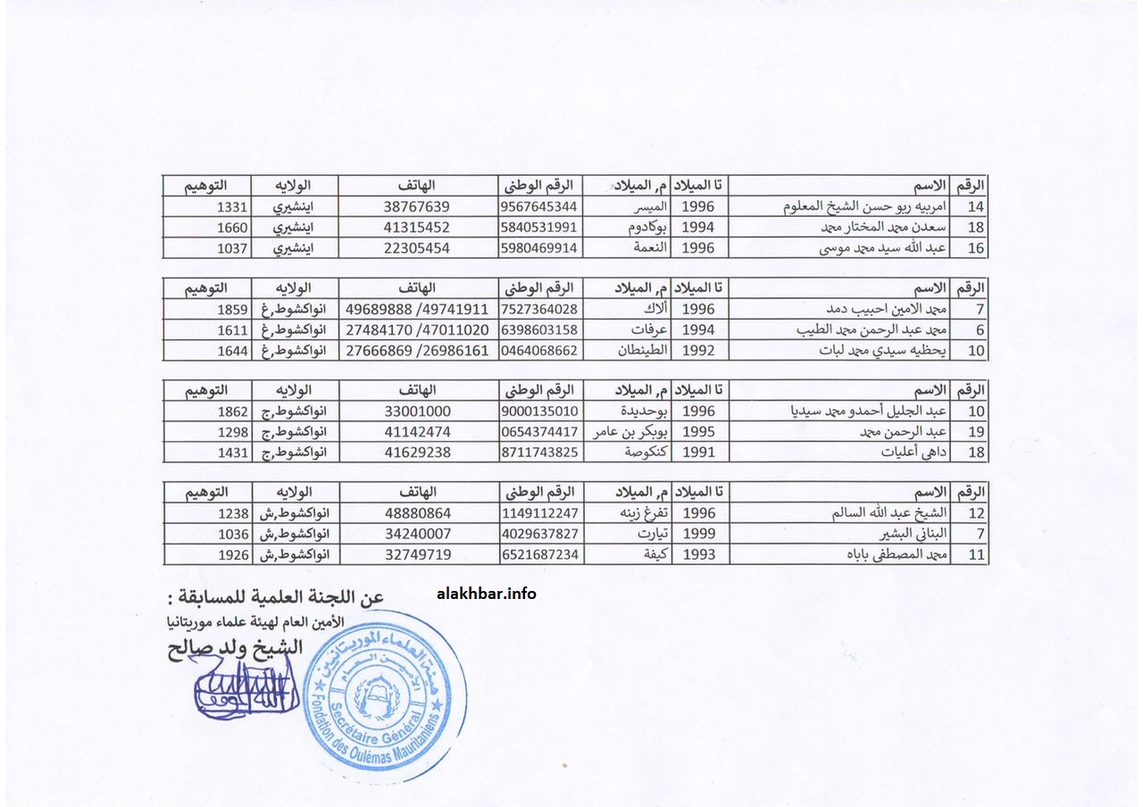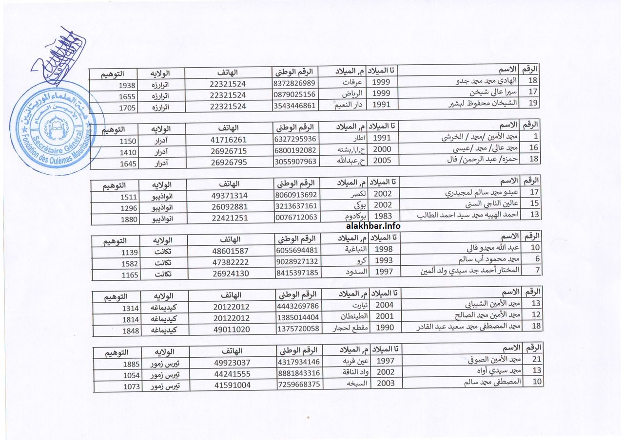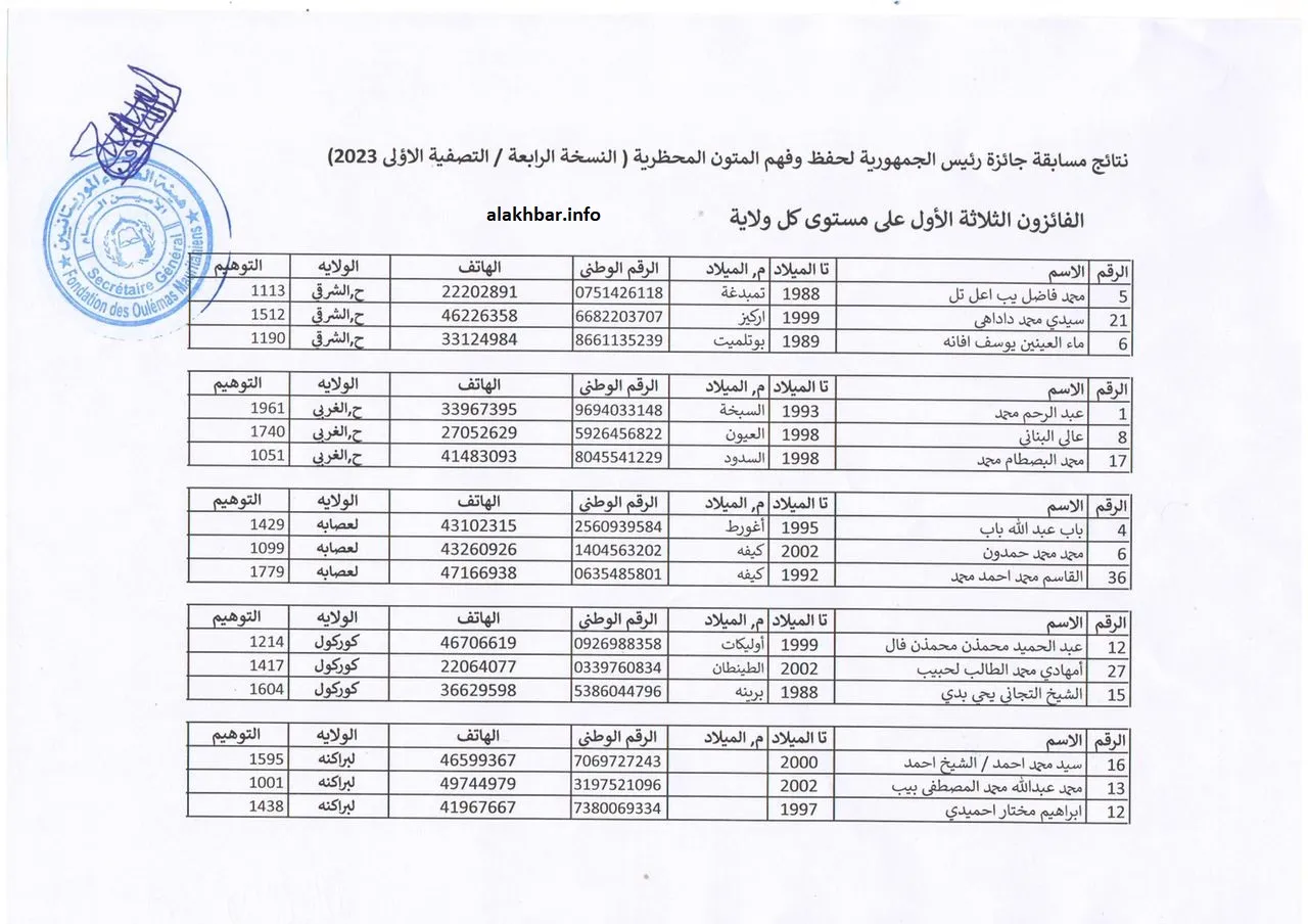 الأخبار (نواكشوط) – أعلنت وزارة الشؤون الإسلامية والتعليم الأصلي أسماء الفائزين في المرحلة الأولى من النسخة الرابعة من “مسابقة رئيس الجمهورية لحفظ وفهم المتون المحظرية”، وضمت القائمة 45 فائزا، أي الثلاثة الأوائل من كل ولاية.