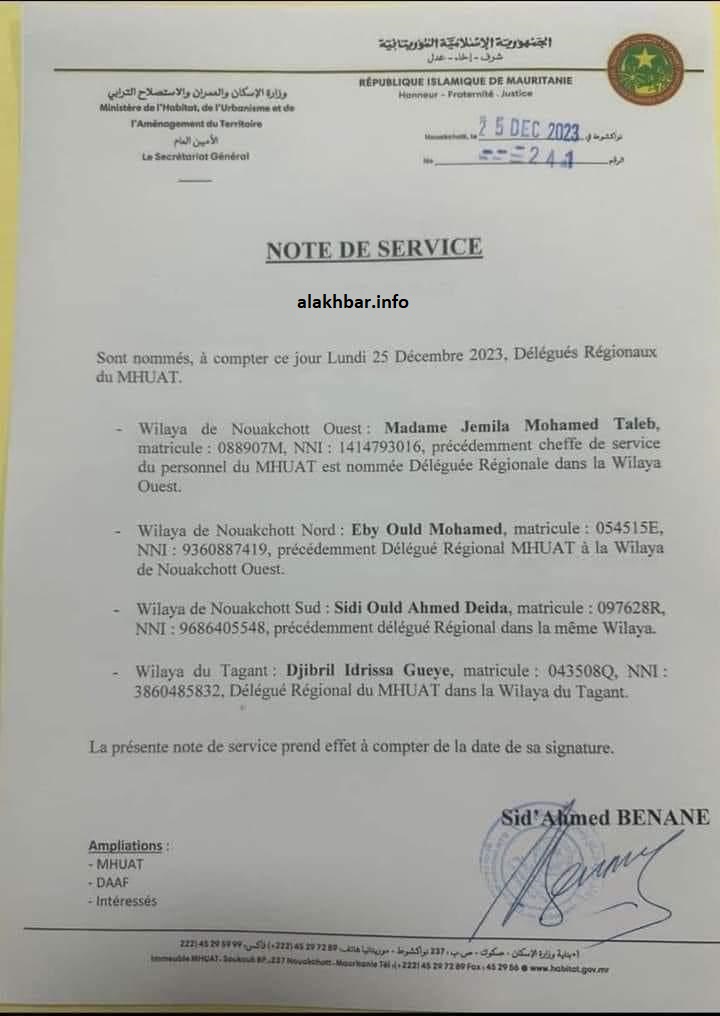 وتم تعيين بنت محمد الطالب بناء على مذكرة وقعها الأمين العام للوزارة سيدي أحمد بنان اليوم الاثنين.