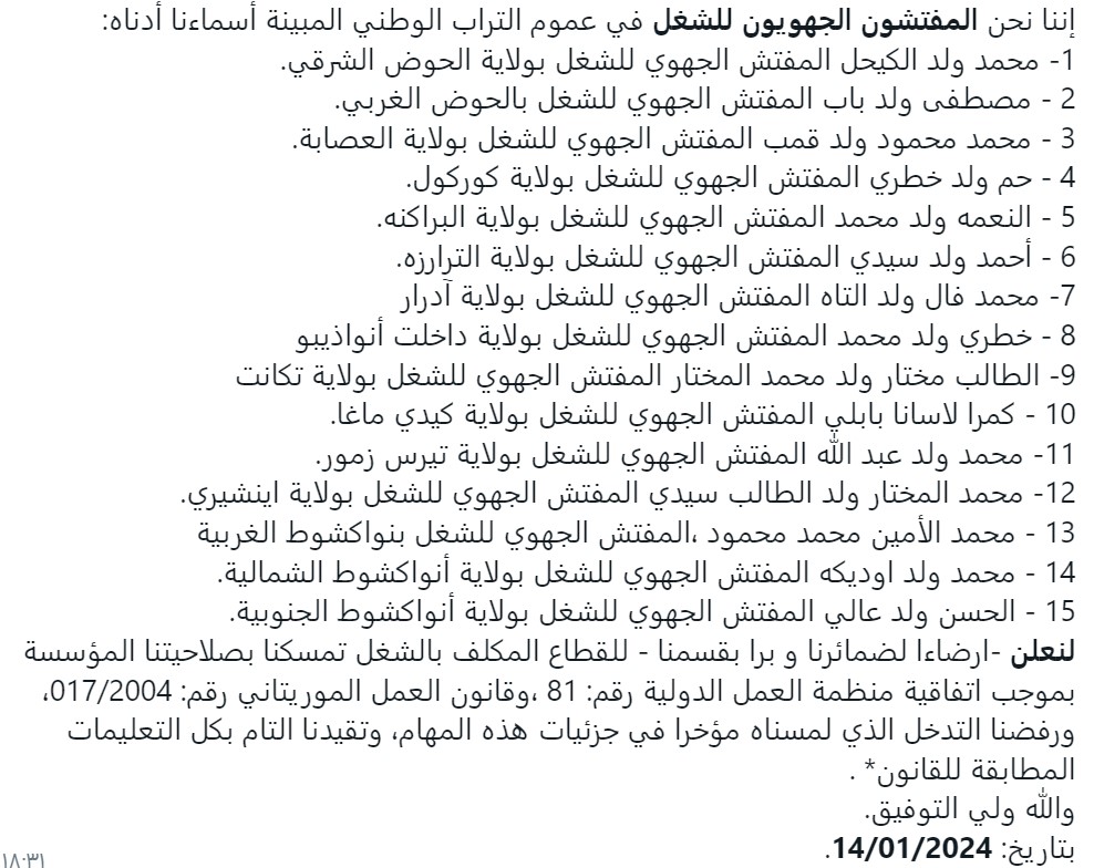 ووقعت الرسالة من طرف مفتشي الشغل في جميع ولايات موريتانيا الخمس عشرة.