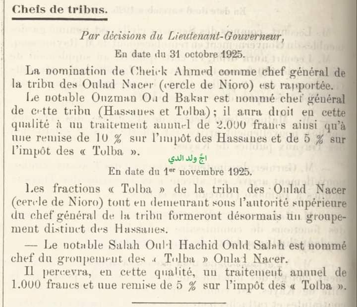 – رسمنة توليته زعامة” طلبة أولاد الناصر” بنشرها في العدد: 467 من الجريدة الرسمية للسودان الفرنسي الصادر بتاريخ: 15نوفمبر سنة 1925 ومنحه امتيازات مالية بناء على هذه الصفة..