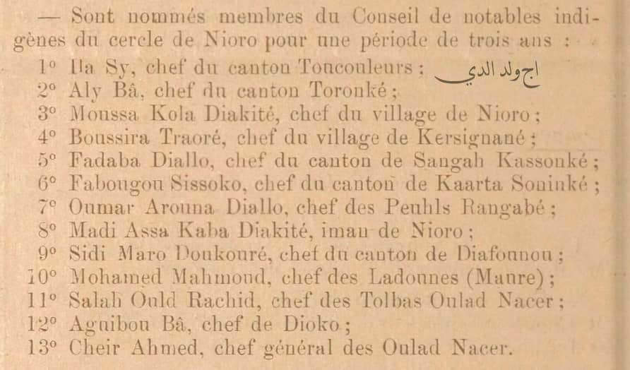 – اختياره منتصف سنة 1924 عضوا في مجلس الأعيان المحلي لدائرة انيورو مع الزعيمين، الشيخ أحمد ولد أعمر، ومحمد محمود ولد عبدلّ ولد اعلي، شيخ عامة قبيلة لادم ضمن كثير من ممثلي القرى والكيانات والأعراق التابعة للدائرة، وذلك بصفته رئيسا لطلبة أولاد الناصر، وقد نشر قرار التعيين في الجريدة الرسمية للسودان الفرنسي؛ العدد رقم: 430 الصادر بتاريخ: 1 مايو 1924 على أن يبدأ العمل به فاتح يوليو من العام نفسه.