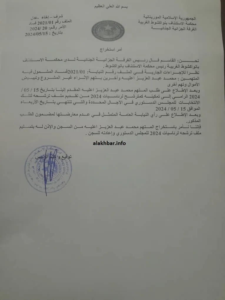 الأخبار (نواكشوط) – أذن القضاء الموريتاني للرئيس السابق محمد ولد عبد العزيز بالخروج من السجن لإيداع ملف ترشحه لرئاسيات يونيو 2024.