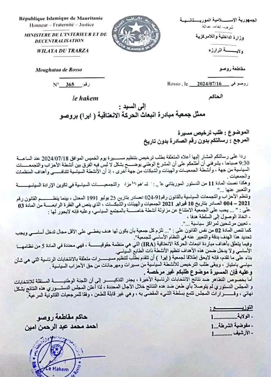 وأشار حاكم مقاطعة روصو في رد على رسالة لممثل الحركة بروصو، إلى أن “إيرا” تعتبر جمعية ولا يحق لها أن تتقدم بطلب لتنظيم مسيرات متعلقة بالانتخابات الرئاسية، التي هي شأن سياسي، مضيفا أن طلب الترخيص للأنشطة السياسية من مسيرات ومهرجانات من حق الأحزاب السياسية.