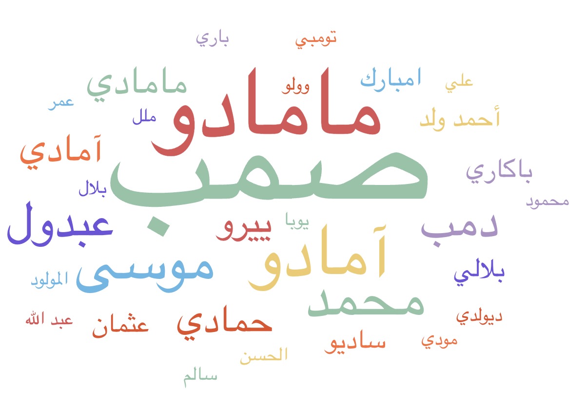 يمثل هذا الرسم البياني الأسماء الأكثر شيوعا في صفوف الجنود الموريتانيين الذين توفوا في الحرب العالمية الأولى. ويعكس حجمُ الاسم تواترَه وكثرةَ وروده في قاعدة المعلومات.