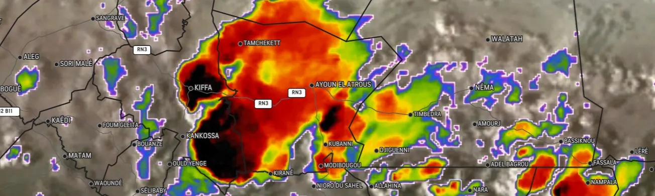 وابتداء من ظهر اليوم يشهد جنوب الحوضين وعلى الأخص جنوب الحوض الغربي تواجد سحب ماطرة خفيفة في الغالب، ويتوقع أن تزداد كثافة ابتداء من عصر اليوم وخصوصا على لعصابه وكيديماغا وكوركول وجنوب غرب الحوض الغربي، وهي ما بين خفيفة إلى متوسطة.