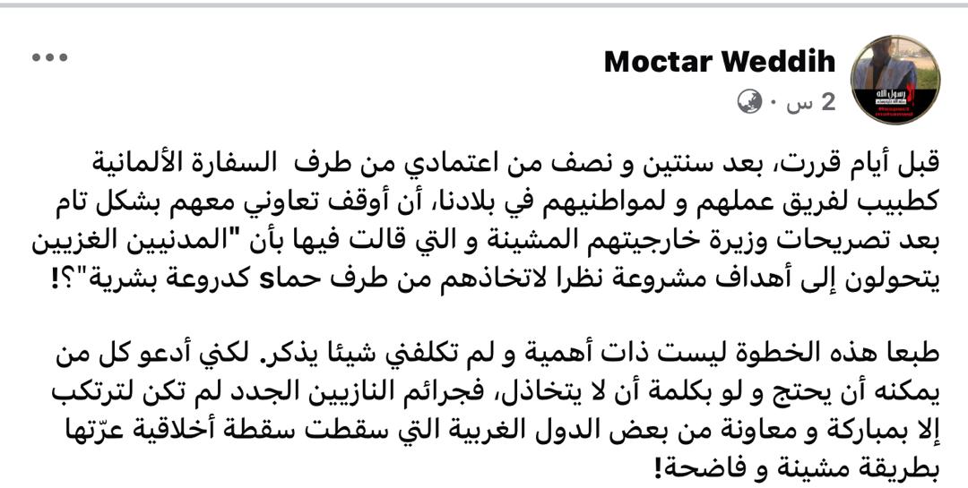 الأخبار (نواكشوط) – أعلن الطبيب الموريتاني الدكتور المختار ولد وديه وقف تعاونه بشكل تام مع السفارة الألمانية في نواكشوط “بعد تصريحات وزيرة خارجيتهم المشينة و التي قالت فيها بأن المدنيين الغزيين يتحولون إلى أهداف مشروعة نظرا لاتخاذهم من طرف حماس كدروعة بشرية”.