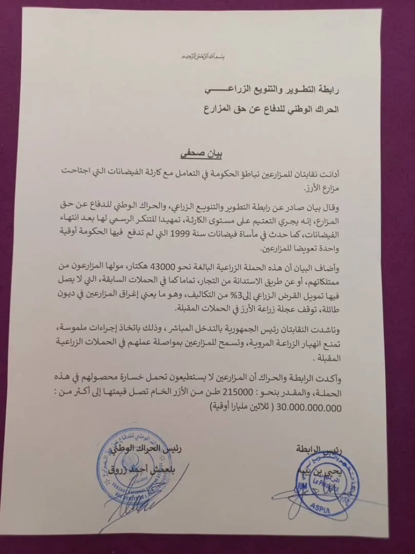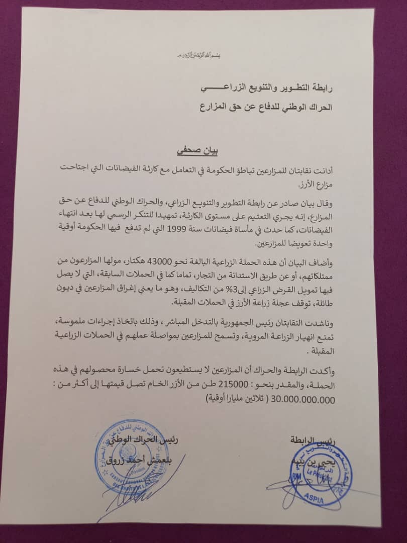 الأخبار (نواكشوط) – قدرت رابطة التطوير والتنويع الزراعي، والحراك الوطني للدفاع عن حق المزارع، حجم خسارة محصول المزارعين بسبب فيضانات نهر السنغال جنوب موريتانيا بـ215.000 طن من الأزر الخام، وهو ما تصل قيمته لأكثر من 30 مليارا أوقية قديمة.