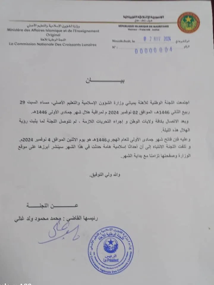 الأخبار (نواكشوط) – أعلنت اللجنة الوطنية للأهلة أن الإثنين- بعد الغد – هو فاتح شهر جمادى الأولى من العام الهجري 1446 هـ، وذلك في ختام اجتماع عقدته الليلة لمتابعة الهلال.