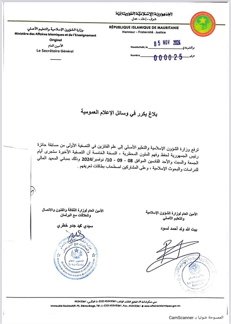 الأخبار (نواكشوط) – حدّدت وزارة الشؤون الإسلامية والتعليم الأصلي أيام : 08 – 09 – 10 من نوفمبر الحالي موعداً لإجراء التصفيات الأخيرة من مسابقة “رئيس الجمهورية لحفظ وفهم المتون المحظرية”.