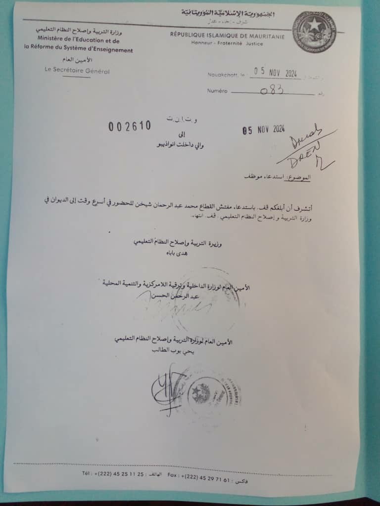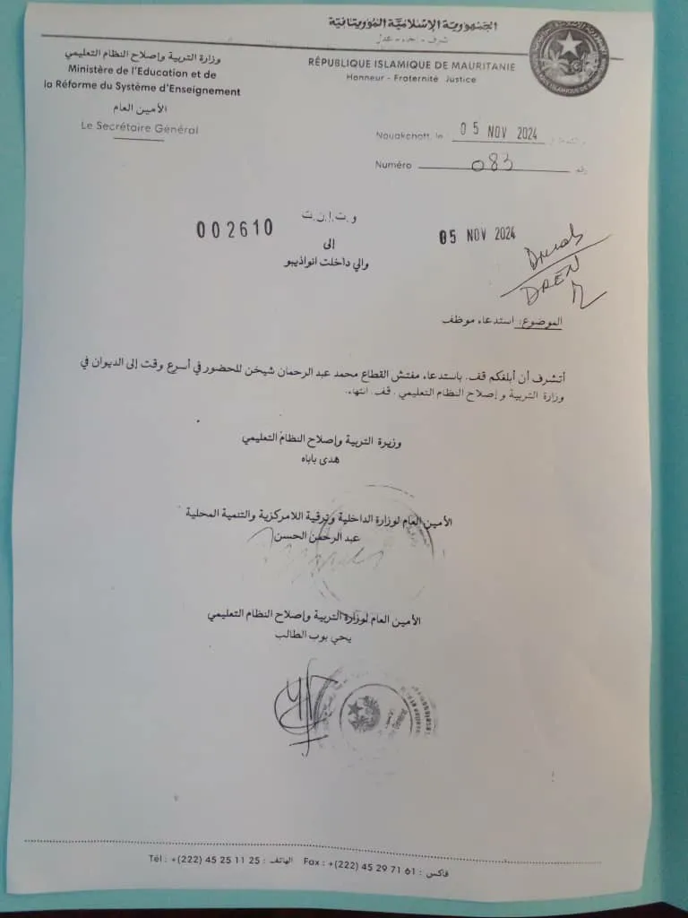 وحسب مذكرة موجهة إلى والي داخلت نواذيبو ، فقد طلب من المفتش الحضور في أسرع وقت إلى ديوان الوزيرة.