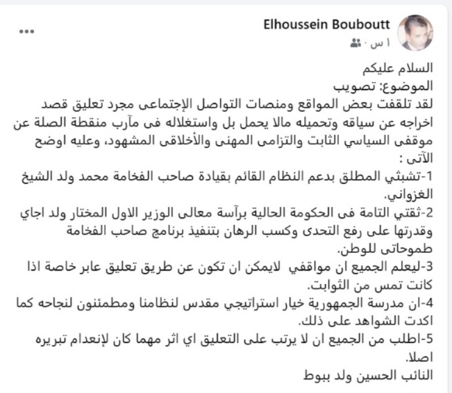 وأضاف ولد بوبوط في تدوينة على حسابه في فيسبوك أن التعليق تم استغلاله في مآرب منقطعة الصلة عن موقفه السياسي الثابت والتزامه المهني والأخلاقي المشهود.