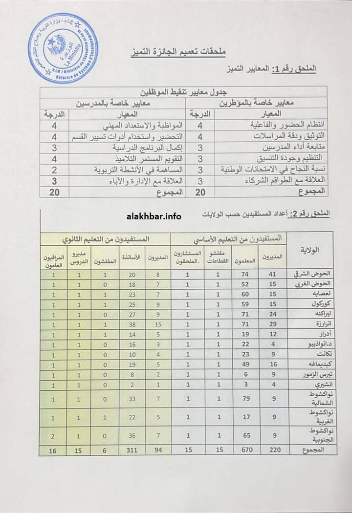 وحددت الوزارة المعايير الخاصة بالمؤطرين في توزيع 20 درجة على معايير هي انتظام الحضور والفاعلية، والتوثيق ودقة المراسلات، مع متابعة أداء المدرسين، والتنظيم وجودة التنسيق، ونسبة النّجاح في الامتحانات الوطنية، والعلاقة مع الطواقم والشركاء.