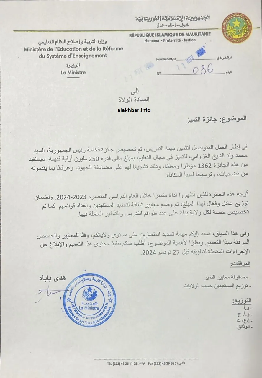 وعرفت ميزانية 2024 المعدلة استحداث بند لجائزة التميز، وذلك ضمن 7 مليارات زيد بها القطاع، وخصص له مبلغ 250.000.000 أوقية قديمة.