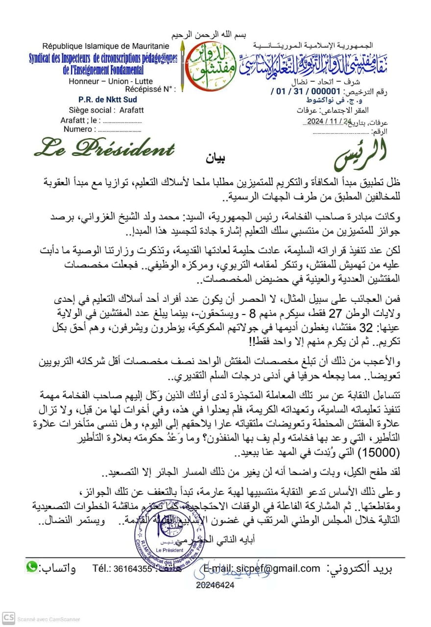 ونبهت النقابة إلى أن “علاوة المفتش المحنطة وتعويضات ملتقياته ما تزال عارا يلاحقهم إلى اليوم” مضيفة: “هل ننسى متأخرات علاوة التأطير، التي وعد بها فخامته ولم يف بها المنفذون؟ وما وَعْدُ حكومته بعلاوة التأطير (15000) التي وُئِدت في المهد عنا ببعيد”.