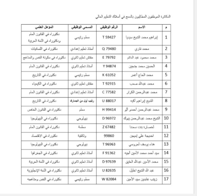 وبهذه المناسبة، وفي ظلّ الحاجة الملحة لقطاع التعليم إلى دكاترة أكفاء يواكبون الزيادة الكبيرة في أعداد الطلاب الناجحين في البكالوريا هذه السنة، فإننا نلتمس من فخامتكم دمجنا مباشرة في أسلاك التعليم العالي، وذلك لأننا باعتراف اللجنة الوطنية للمسابقات قد استوفينا شروط اكتتاب أساتذة التعليم العالي المتعلقة بكلّ من الملف الأكاديمي ومطابَقة متطلبات المقاعد التي ترشحنا لها في مسابقة اكتتاب أساتذة التعليم العالي الحالية، علمًا أن دمجنا في التعليم العالي لا يتطلّب اعتمادات مالية جديدة فنحن موظفون حاصلون على اعتمادات مالية منذ عقود.