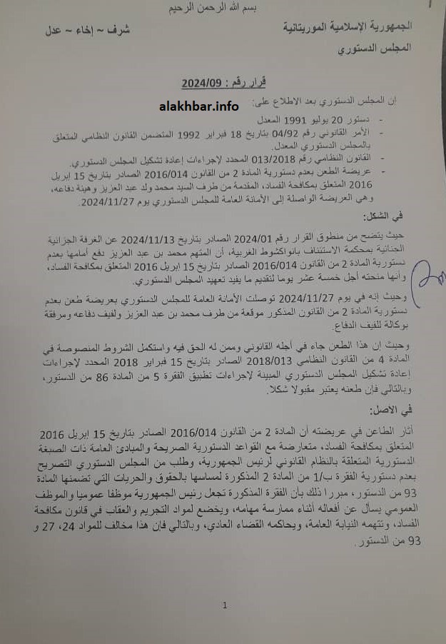 – عريضة الطعن بعدم دستورية المادة: 2 من القانون: 014/2016 الصادر بتاريخ: 15 إبريل 2016 المتعلق بمكافحة الفساد، المقدمة من طرف السيد محمد ولد عبد العزيز وهيئة دفاعه، وهي العريضة الواصلة إلى الأمانة العامة للمجلس الدستوري يوم 27/11/2024.