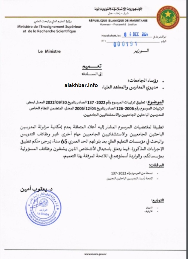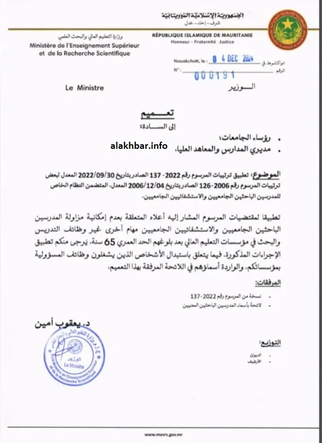 الأخبار (نواكشوط) – وجه وزير التعليم العالي والبحث العالمي يعقوب ولد امين تعميما إلى رؤساء الجامعات ومديري المدارس والمعاهد العليا، أمرهم فيه بتطبيق ترتيبات المرسوم القاضي بتفريغ الأساتذة الجامعيين الذي وصلوا إلى 65 سنة “لمهام البحث والتدريس”.