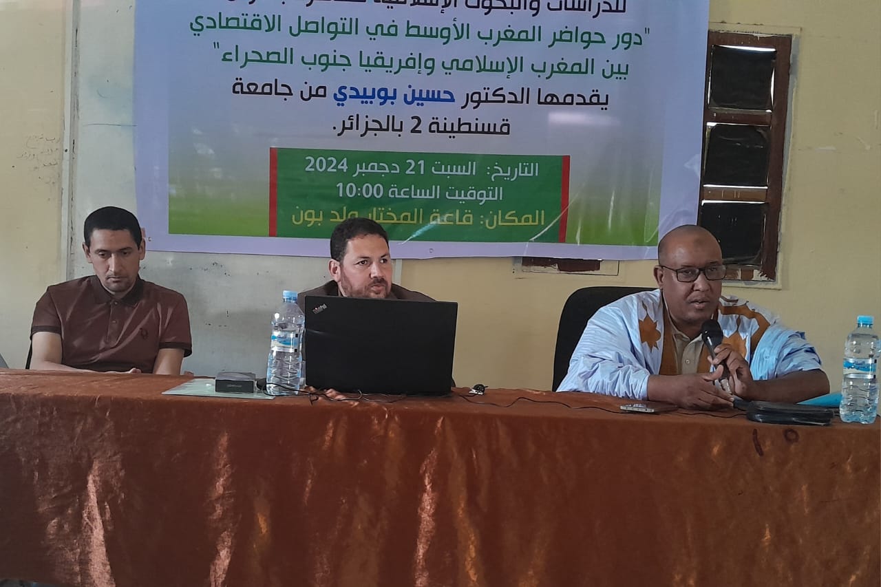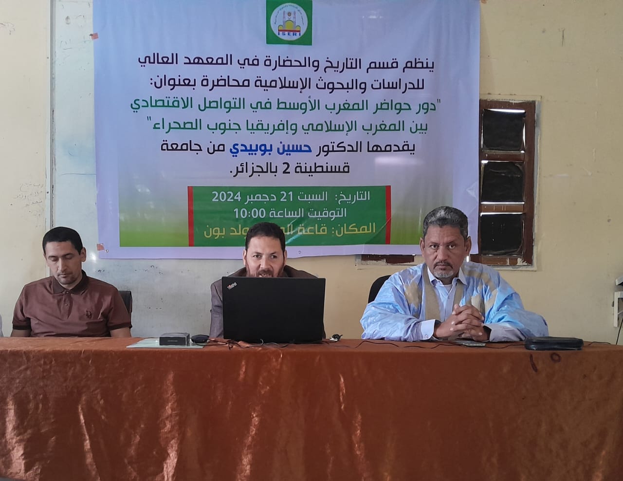 الأخبار (نواكشوط) – نظم قسم التاريخ والحضارة في المعهد العالي للدراسات والبحوث الإسلامية أمس محاضرة بعنوان: “دور حواضر المغرب الأوسط في التواصل الاقتصادي بين المغرب الاسلامي وإفريقيا جنوب الصحراء”.