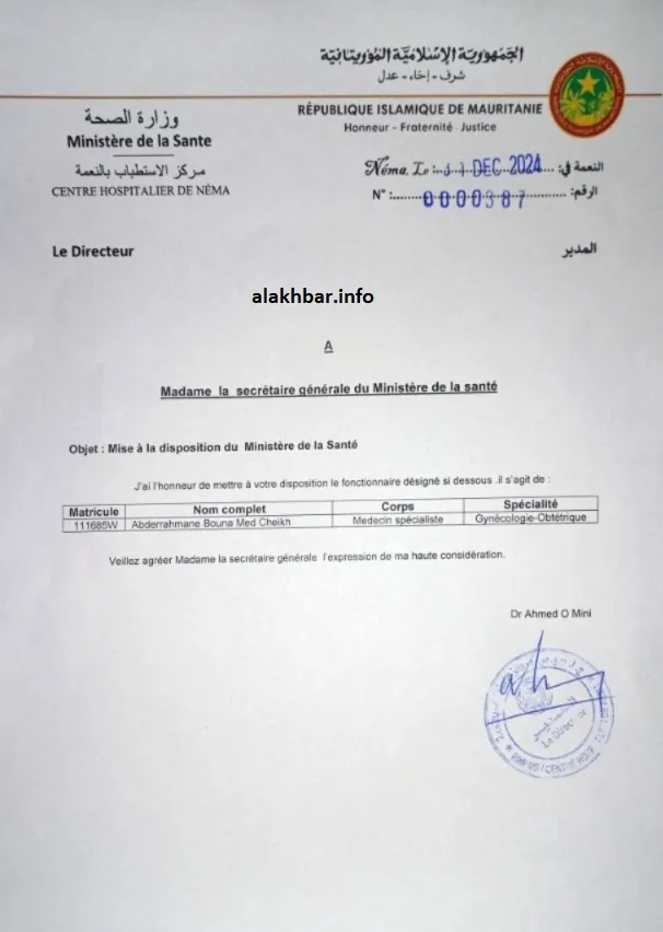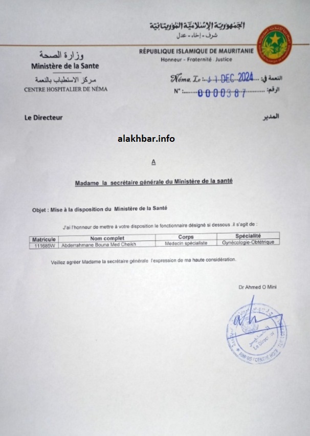 وحصلت وكالة الأخبار المستقلة على الرسالة التي وقّعها مدير المستشفى الدكتور أحمد ولد ميني اليوم، وجهها إلى الأمينة العامة لوزارة الصحة يعيد بموجبها ولد بونا إلى وزارة الصحة.