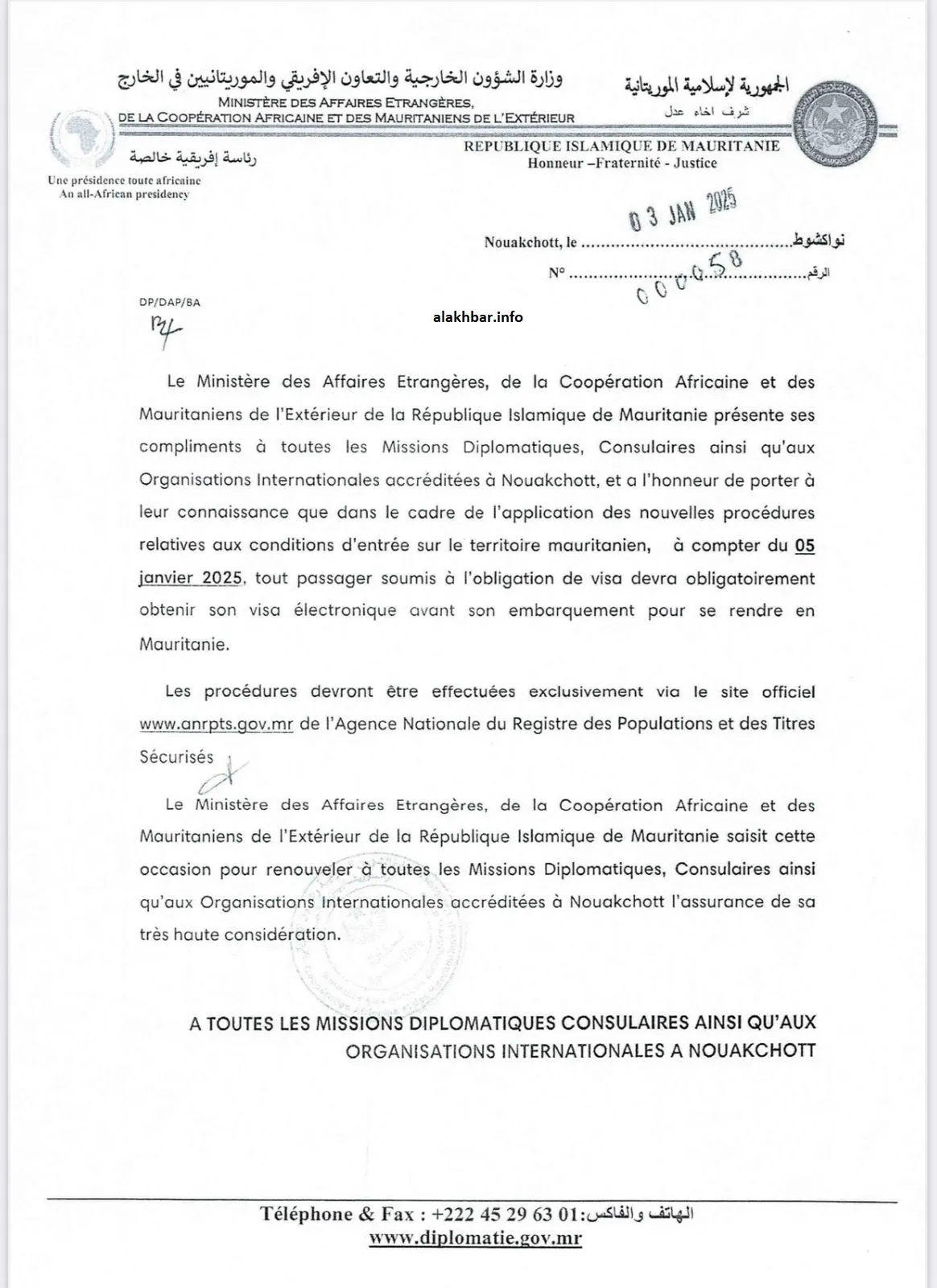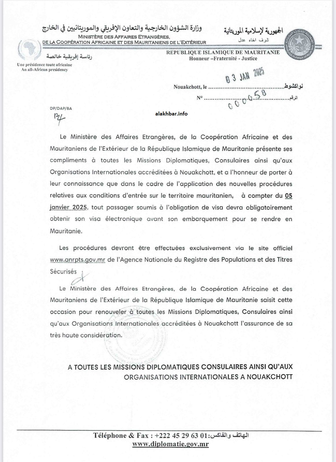 وأبلغت وزارة الخارجية الموريتانية البعثات الدبلوماسية الموريتانية في الخارج، وكذا البعثات الدبلوماسية المعتمدة في موريتانيا بالإجراء الجديد، مؤكدة أنه سيدخل حيز التنفيذ ابتداء من يوم غد الأحد 05 يناير 2025.