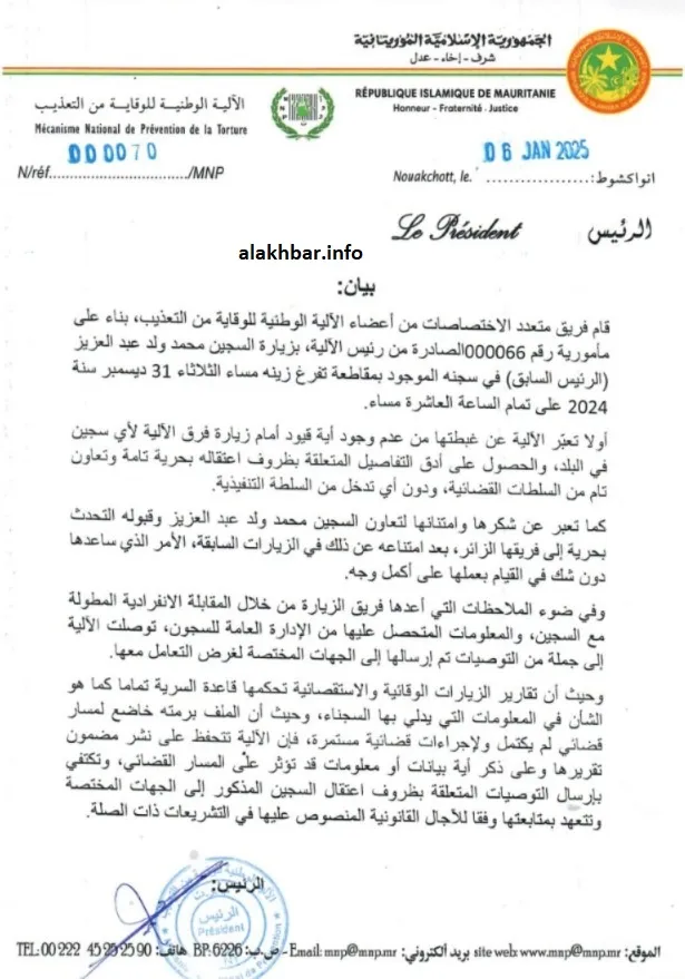وذكرت الآلية في بيان تلقت وكالة الأخبار المستقلة نسخة منه بأن ولد عبد العزيز امتنع عن ذلك في زيارات سابقة، لافتة إلى أن هذا التعاطي ساعدها دون شك في القيام بعملها على أكمل وجه.