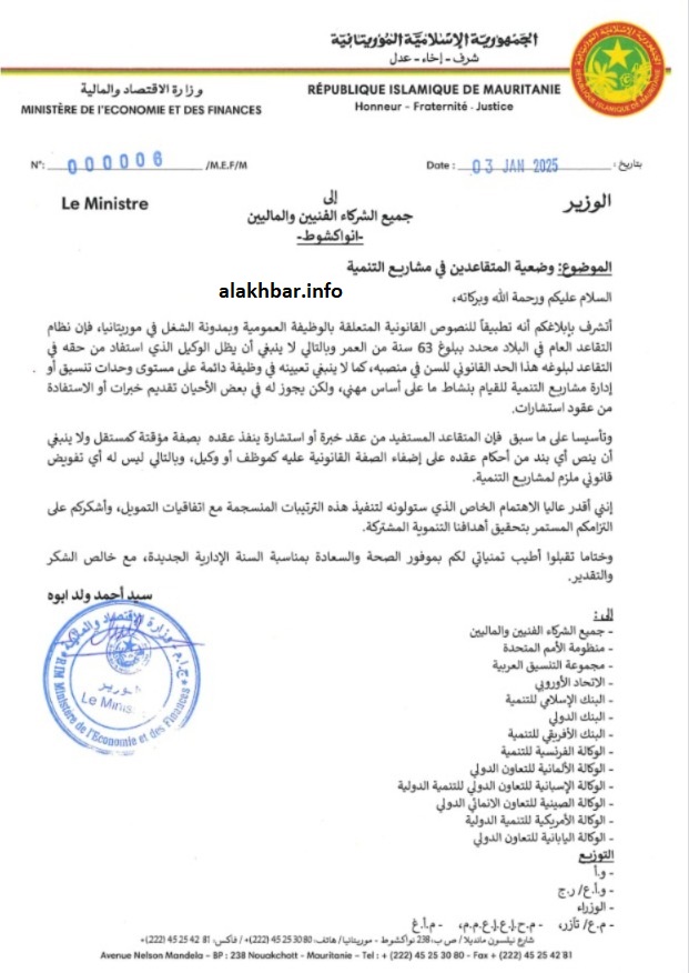 وأكد وزير الاقتصاد والمالية سيدي أحمد ولد ابوه لشركاء موريتانيا في التنمية عبر رسالة وجهها إليهم أن نظام التقاعد العام في البلاد محدد ببلوغ 63 سنة، “وبالتالي لا ينبغي أن يظل الوكيل الذي استفاد من حقه في التقاعد لبلوغه هذا الحد القانوني للسن في منصبه”.
