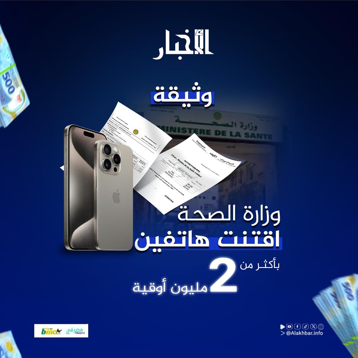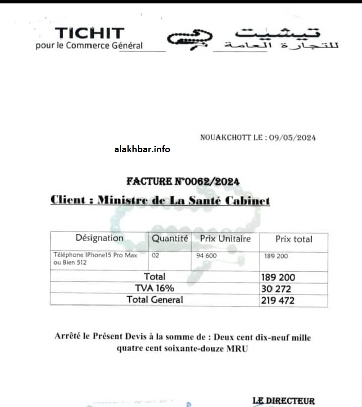 الأخبار (نواكشوط) – كشفت وثيقة حصلت عليها وكالة الأخبار المستقلة أن وزارة الصحة اقتنت شهر مايو الماضي هاتفين من نوع “أيفون 15” بأكثر من مليوني أوقية قديمة، وهو سعر يقارب ضعف سعرهم المعلن من طرف شركة “آبل”، وكذا أسعارهم في الأسواق الموريتانية.