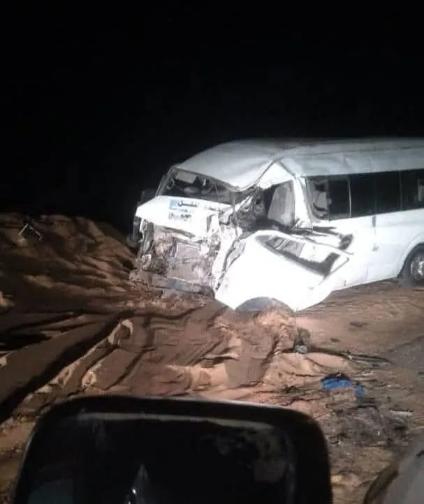 ووقع الحادث إثر اصطدام باص نقل بجرافة كانت تزيح الرمال عن الطريق.