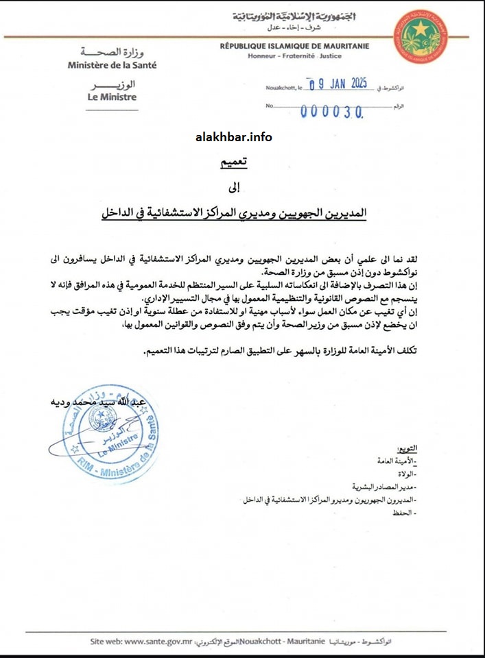 الأخبار (نواكشوط) – أبلغ وزير الصحة الدكتور عبد الله وديه المديرين الجهويين ومديري المراكز الاستشفائية في الداخل أن أي “تغيب عن مكان العمل سواء لأسباب مهنية أو للاستفادة من عطلة سنوية أو إذن تغيب مؤقت يجب أن يخضع لإذن مسبق من وزير الصحة”.