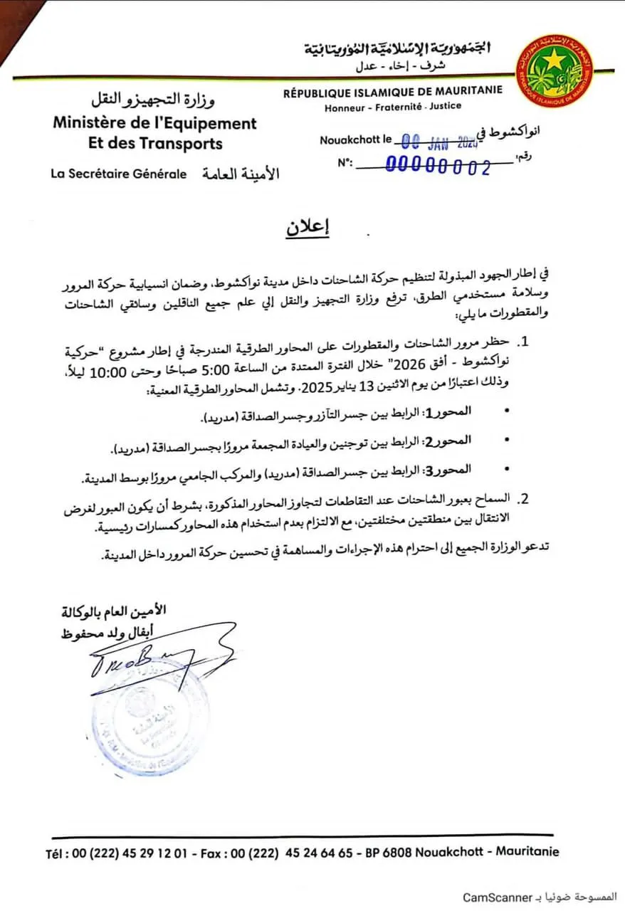 الأخبار (نواكشوط) – أعلنت وزارة التجهيز والنقل حظر مرور الشاحنات والمقطورات على المحاور الطرقية المندرجة في إطار مشروع “حركية نواكشوط – أفق 2026” خلال الفترة الممتدة من الساعة 5:00 صباحًا وحتى 10:00 ليلاً.