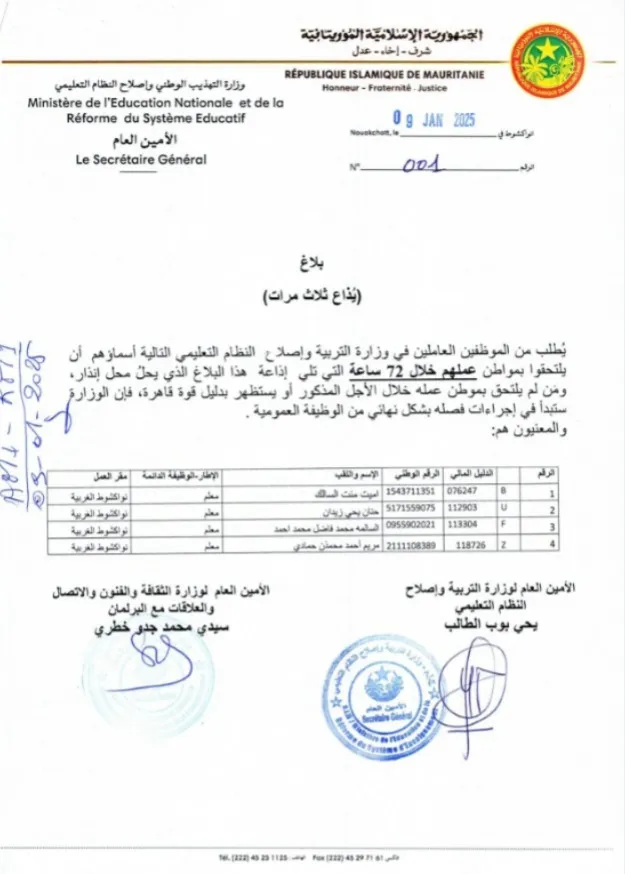 الأخبار (نواكشوط) – دعت وزارة التربية وإصلاح النظام التعليمي أربعة من موظفيها لالتحاق بعملهم في ظرف 72 ساعة.