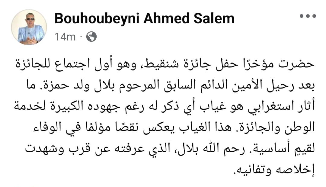 وأضاف ولد بوحبيني في تدوينة على حسابه في فيسبوك بأن عدم ذكر ولد حمزه في أول حفل تنظمه اللجنة بعد رحيله أثار استغرابه.