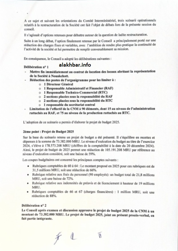 مجلس الإدارة قرر تقليص ميزانية الشركة للعام 2025 بنسبة 59%، وطال هذا التقليص مختلف مكونات الميزانية، بنسب تراوحت بين 66 و72%، فيما خصص المجلس مبلغ 190 مليون أوقية قديمة للتعويض والفصل.