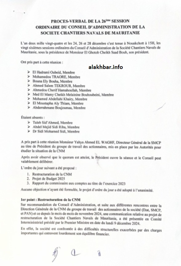 وحضر اجتماع مجلس إدارة الشركة – الذي يرأسه القطب ولد الشيخ سعد بوه – المدير العام للشركة الموريتانية لتسويق الأسماك يحي ولد أحمد الوقف، وهو رئيس مجموعة عمل المساهمين، التي كلفت من السلطات بدراسة وضعية الشركة.
